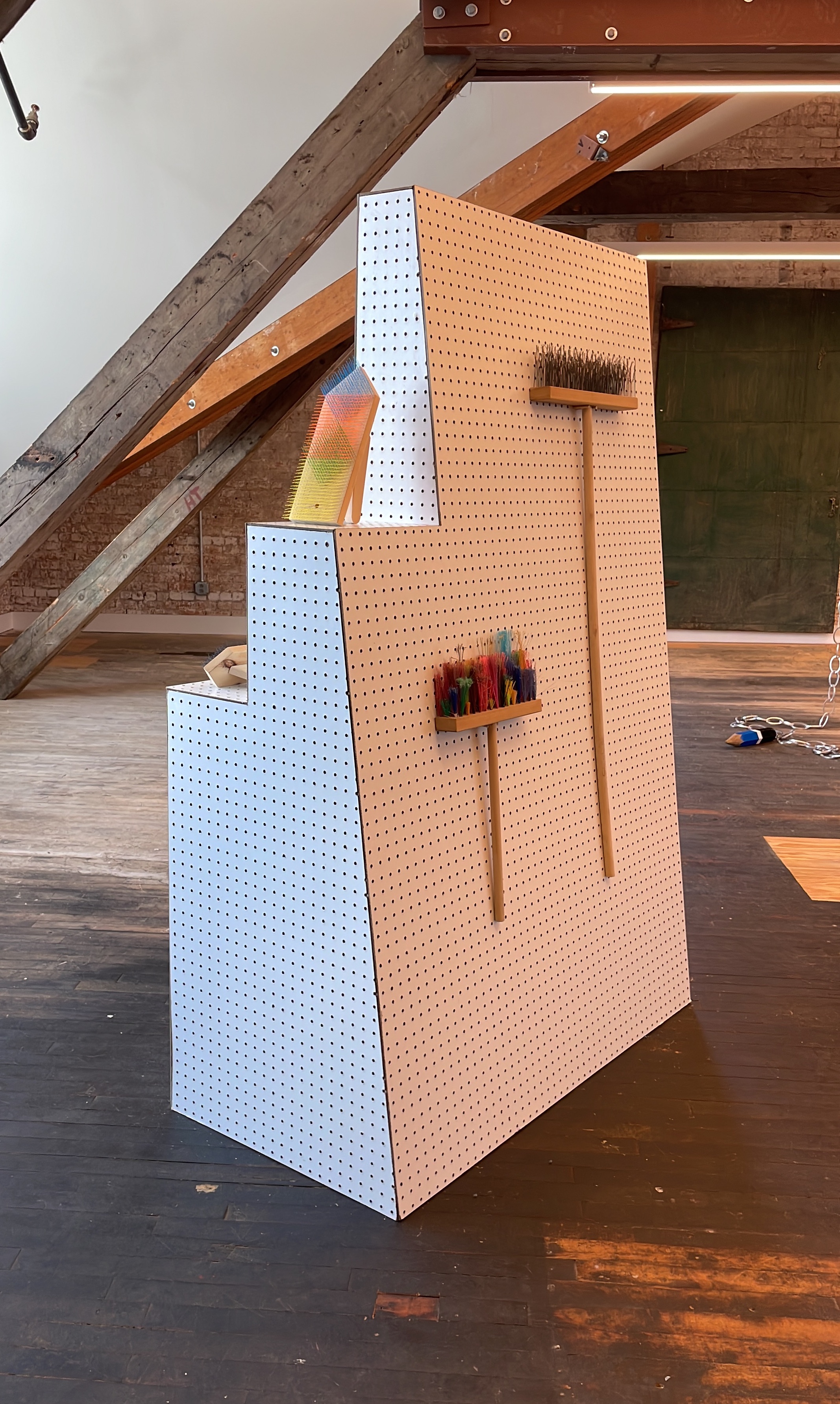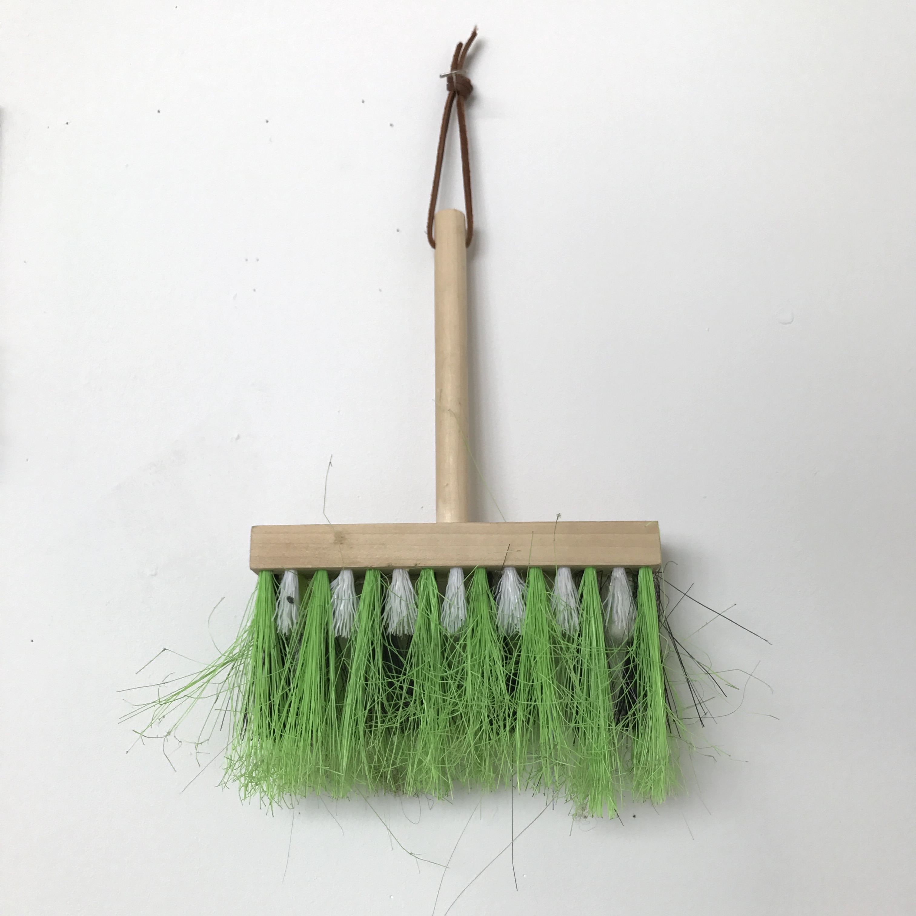 For this series of sculptures, I collect found brooms and brushes in all conditions and repurpose their parts with custom fabricated elements. I playfully combine dirty and colorful bristles to make new compositions that encapsulate the memory of past cleanings while projecting imaginary functions. Ideas of abstraction, color and light mix with forms of scrubbing and sweeping. Some sculptures have complex geometric patterns that create a kinetic and rhythmic effect – echoing the movement of a broom. Other sculptures mimic forms found in nature to uncanny ends. Each takes on an ambiguous position between functional tool and object of contemplation, creating space for new associations and values.